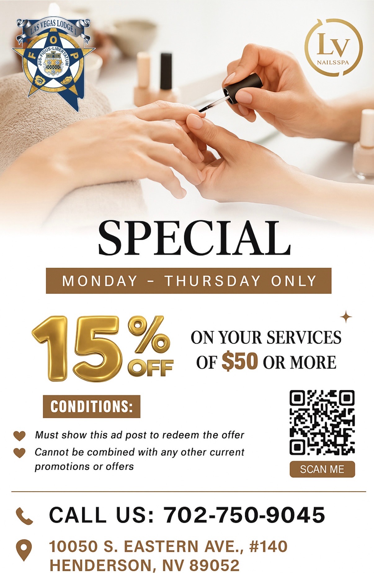 Members of the Las Vegas Fraternal Order of Police Lodge 1 are provided with access to exclusive deals, discounts, and special offers through partnerships with businesses and organizations that stand in support of law enforcement. These benefits are an extension of our mission to serve those who serve, offering meaningful value to members and their families. Each partnership reflects a commitment to recognizing the sacrifices made by officers and to providing resources that contribute to their well-being both personally and professionally. We will continue to grow and strengthen these relationships so that membership in Lodge 1 remains a source of ongoing support, recognition, and appreciation for the men and women behind the badge.